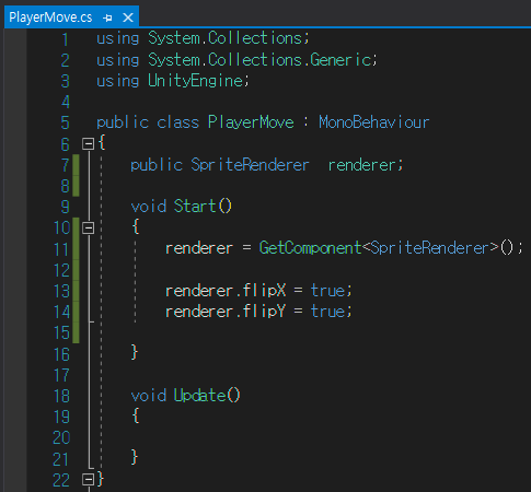여기에서는 스프라이트 렌더러 선언, 초기화/활성화,비활성화/Flip/Color를 스크립트에서 설정해보자.