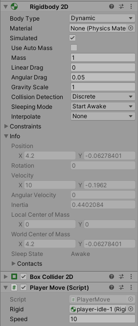 실행했을때 rigidbody2d에 velocity값이 10으로 변하는것을 볼 수 있다.