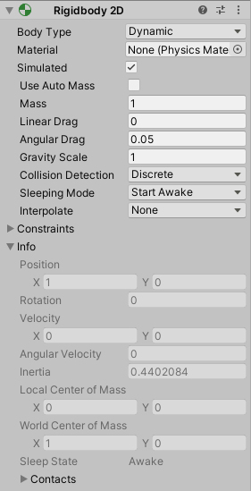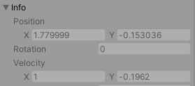 여기에서 Info에 펼침단추를 눌러보면 Position, Rotation, Velocity 등등을 가지고 있다.