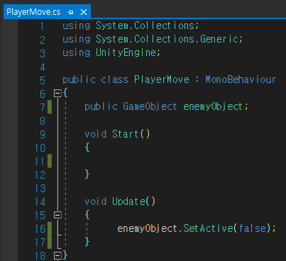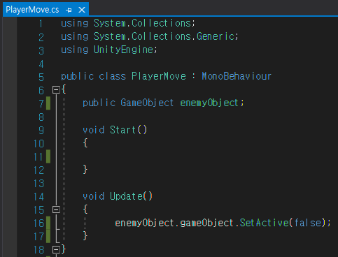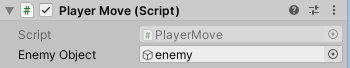 이제부터 PlayerMove 스크립트에서 enemyObject라고 칭하는 것은 enemy의 게임오브젝트로 사용할 수 있다.