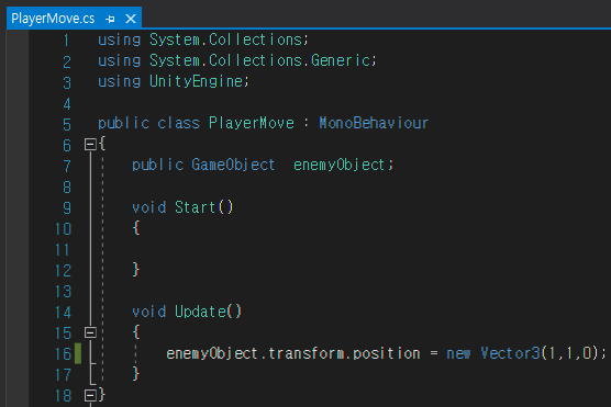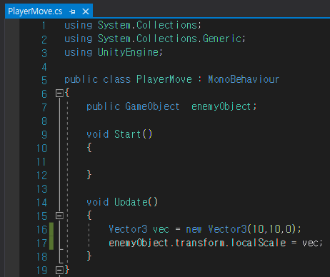 에너미 오브젝트 사용하기 위해서는 에너미에 게임오브젝트를 선언해 줘야한다.